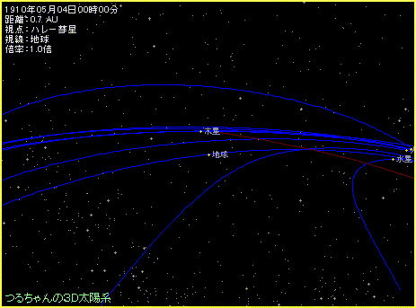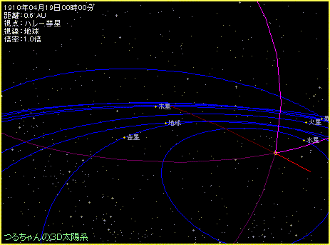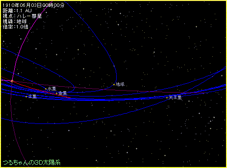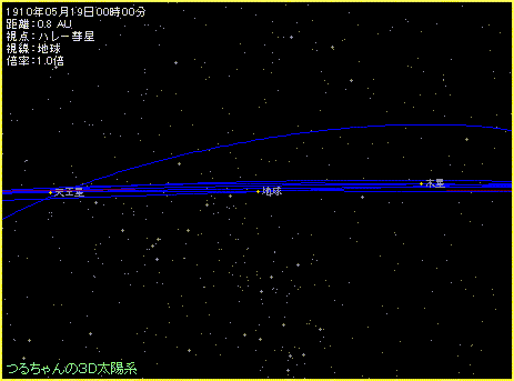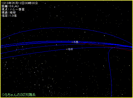 この様子を「つるちゃんの3D太陽系のシェア版」を使って、ハレー彗星に乗って地球を眺めるという方法で再現してみましょう。