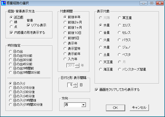 (2)従来は時刻指定で「日の出XX」を選択した場合は「東」、「日の入りXX」を選択した場合は「西」が自動的に選択されていました。今回のバージョンアップでは、「北」「東」「南」「西」「北東」「南東」「南西」「北西」の8方位から選択できるようになりました。これによって水星、金星以外の天体にも柔軟に対応できるようになります。