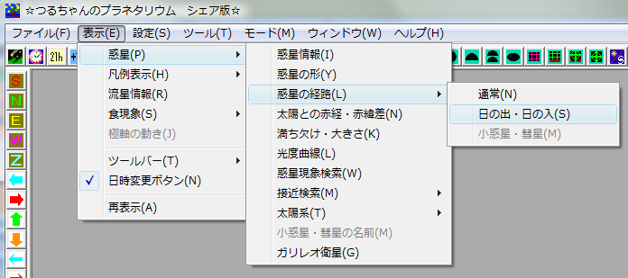 日の出・日の入り時刻の惑星経路を表示するには、メニューバーより[表示]−[惑星]−[惑星の経路]−[日の出・日の入り]を選択します。この方法は従来から変更はありません。