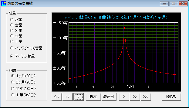 「つるプラ」のシェア版を使うと、水星、金星、火星、木星、土星、および彗星の明るさをグラフ表示することができます。2013年11月明るくなるアイソン彗星は、満月並みの明るさに達すると言われますが、「つるプラ」では計算するピッチ(時間の間隔)が長いため、アイソン彗星のピーク時の光度曲線を正しく表示することができませんでした。新バージョンでは期間を1ヶ月とした場合に限り、計算するピッチを短くすることにより、概ね正しく表示することができるようになりました。(下のグラフを参照)