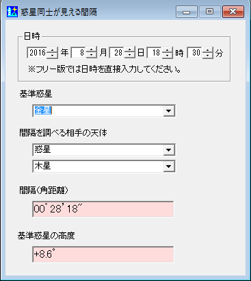 今回のバージョンアップでは、惑星同士が見える間隔のウィンドウに基準惑星の高度を追加しました。これにより、惑星同士の接近の際、地平線上にあって実際に見ることができるかがわかるようになります。