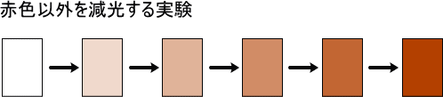 ここでちょっと、皆既月食を想定した色の実験をしてみましょう。パソコンで表示される色はRGBといって赤、緑、青という3色の組み合わせで表現されています。白色は3色全てが最も明るくなった状態ですが、ここから一定の割合で色別に明るさを少しずつ減らしていきます。明るさを減らすのは、地球の大気によって太陽の光が吸収されていくことを意味します。