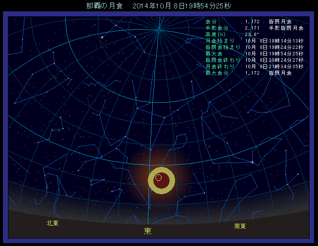 多くの月食ではそれほど気にする必要はありませんが、月出帯食や月没帯食となる場合は少し注意が必要です。というのは、月の出時刻、月の入り時刻の違いによって、どこまで月食を見ることができるかが違ってくるからです。どんなにがんばっても、月が地平線下にあっては月食を見ることはできません。