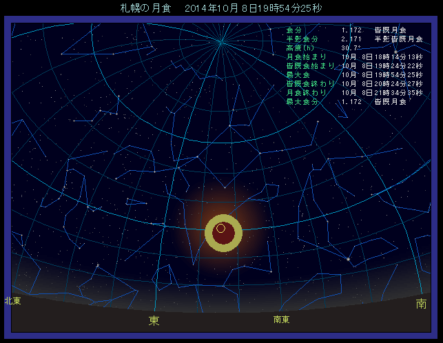 日食の場合は観測する場所によって開始時刻や終了時刻、欠ける割合(食分)が違ってきます。しかし月食の場合は、地球上のどこから見ても同じ見え方をします。東京で見ても札幌で見ても福岡で見ても、月食の開始時刻や終了時刻、最も欠ける時刻や欠ける割合は全部同じです。