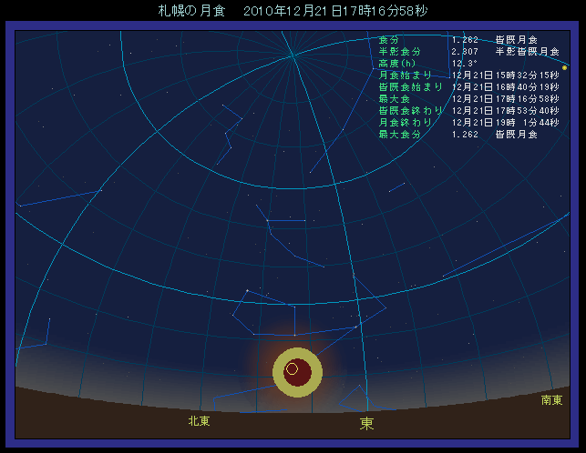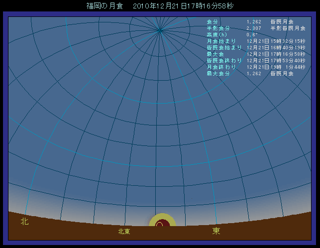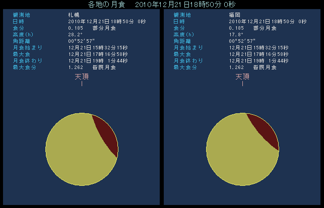 2010年の皆既月食では月出帯食となりますから、下の例のように札幌と福岡では少しの位置の違いが空の状態に大きく影響していることがわかります。