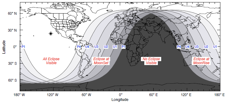 下はNASAが提供する月食図です。白い部分は月食を最初から最後まで見ることができますが、黒く塗られた部分は月食を全く見ることができません。それ以外は一部だけを見ることができる領域です。月食図を見ると、日本付近はU1、U2、U3の線がかかっています。これらの意味は下のようになっています。