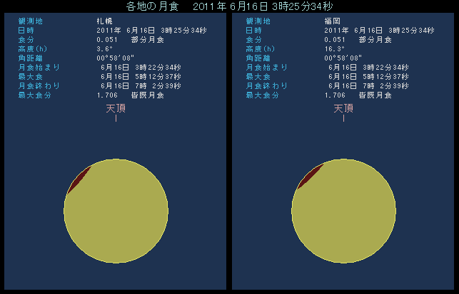 また欠ける方向も少しだけ違います。下に示した札幌と福岡の違いの例をご覧ください。福岡よりも札幌の方が少しだけ天頂に近い側から欠け始めることがわかります。といっても大した違いではないことがおわかりいただけるでしょう。