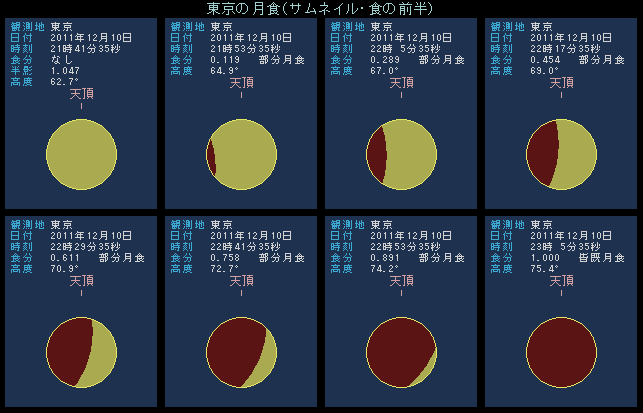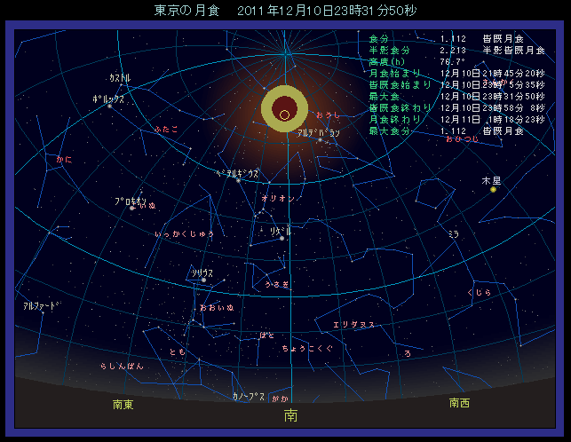 半影食の始まり 10日 20時31.8分 部分食の始まり 21時45.4分 皆既の始まり 23時05.7分 食の最大 23時31.8分 皆既の終わり 23時58.0分 部分食の終わり 11日 01時18.3分 半影食の終わり 02時31.7分 最大食分 1.110