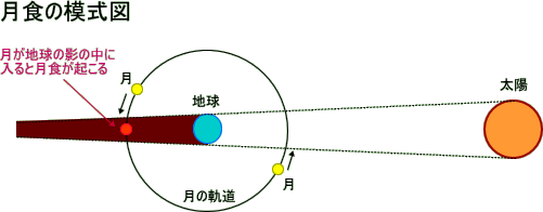 月が地球のまわりをを公転するうちに、地球の影の中へ入ってしまうことがあります。この時、地球の影に入った部分は太陽の光が当たらなくなって欠けて見えます。このような天文現象を月食といいます。冒頭で書きましたように、月が影の中にすっぽり入ってしまった場合は、特に皆既月食といいます。