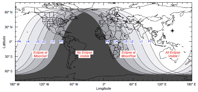 下はNASAが提供する月食図です。白い部分では月食を最初から最後まで見ることができますが、黒く塗られた部分では月食を全く見ることができません。それ以外は一部だけを見ることができる領域です。月食図を見ると日本付近は白いエリアの中に入っており、全経過を観察できることがわかります。また、星印が日本の真南にあることから、最大食となる頃に月が南中し、世界的に見ても日本が最も好条件であることがわかります。