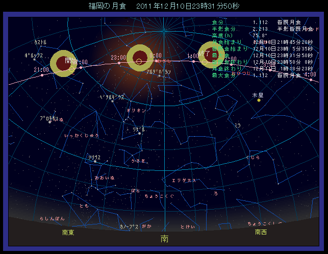 観測する場所によって月食の見え方がどう違うか。実は月が欠ける割合など、食の進行状況は日本全国どこで見ても同じです。それでは何が違うのかというと、一番違っているのは月が見える位置です。これは観測場所によって経度と緯度が違うことによります。