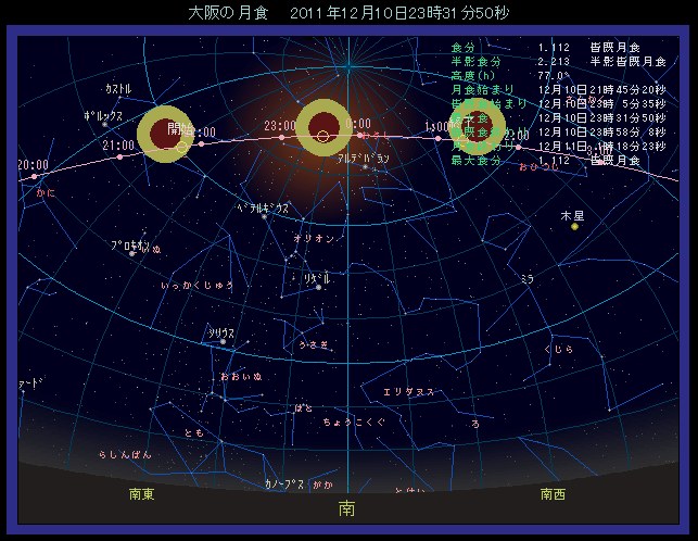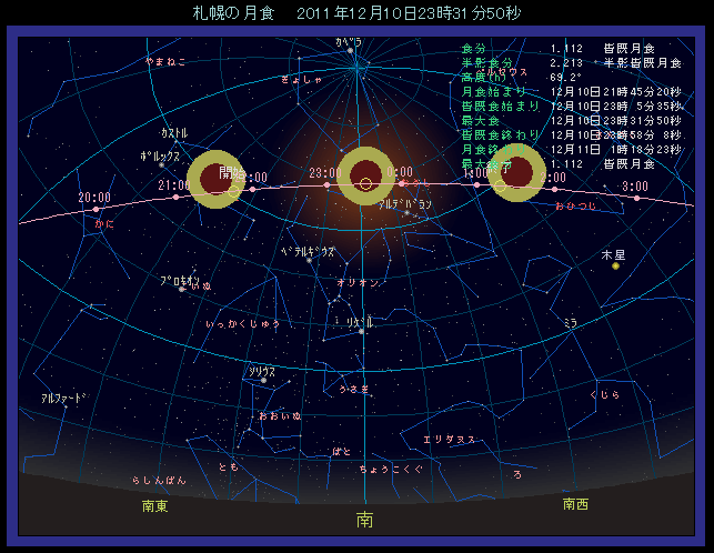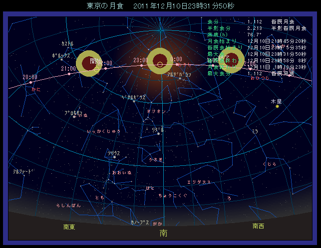 観測地点の緯度によっても月の位置が違ってきます。上の図をご覧いただくとわかりますが、緯度が高い(北に位置する)地点ほど月の高度が低くなっています。逆に緯度が低い(南に位置する)地点ほど月の高度が高くなっています。今回の月食では南中する頃に食の最大となりますから、緯度の違いが月の高度へ如実に反映されています。