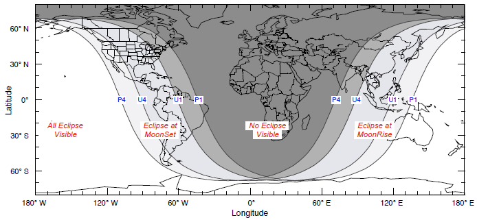 日本付近を見ると、U1の線が日本列島の上を通っています。これは月の出となる時刻に月食が始まる線です。この線よりも西側(左側)では月の出時点で既に月食が始まっており、月が欠けたまま昇ってきます。しかし、最大食時に月の出となるU4の線よりも東側(右側)にありますから、最大食を日本全国で見ることができます。