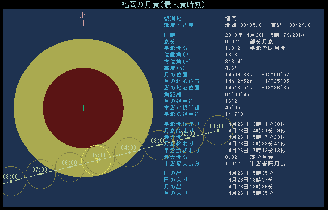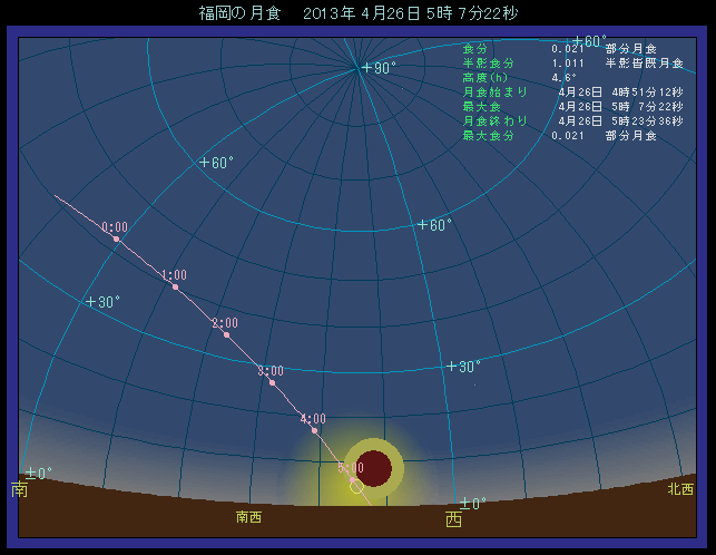2013年4月26日の月食は4時51分に始まり、時刻は全国共通です。地球による影の縁は日食と違ってぼやけてハッキリしませんから、時間は目安程度にお考えください。月食の始まりから16分ほどが経過し、5時7分になると最大食を迎えます。食分は0.020ということで、かろうじて月食になる程度です。肉眼で見ると、月の右上側が少し暗くなっているのがわかるでしょう。最大食の後は16分ほどで元の満月に戻り、5時24分に地球の本影を抜け出して月食は終了します。食が浅いだけに、全体を通しても32分間という、短時間の月食となります。