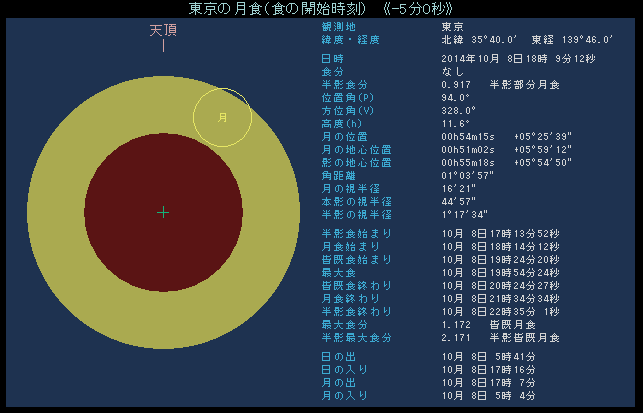 下の図は月食開始5分前、18時9分における月の位置を示したものです。本影は赤いエリアで、半影は薄い黄色で示されています。当日は、本影に近い月の左下と、まだ半影にも入っていない右上を見比べてくださいね。