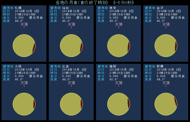 月食では、場所によらず食の進行(欠ける割合)は同じですが、欠ける方向は少しだけ違います。欠け始めの頃は各地とも同じように左下方向が欠けていて、ハッキリした違いはわからないかもしれません。しかし終了が近づいた頃で比較すると、札幌では右方向からやや下側が欠けているのに対し、那覇では右方向からやや上側が欠けていますね。