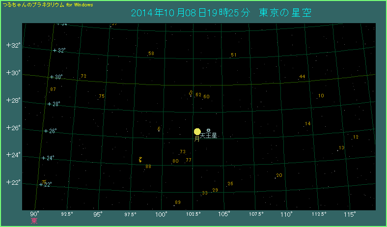 この日、月が天王星に0.9度まで近づいています。月の視直径はおよそ0.5度ですから、月を2個並べたくらいの間隔です。双眼鏡なら同一視野で見ることができるでしょう。
