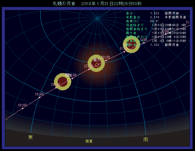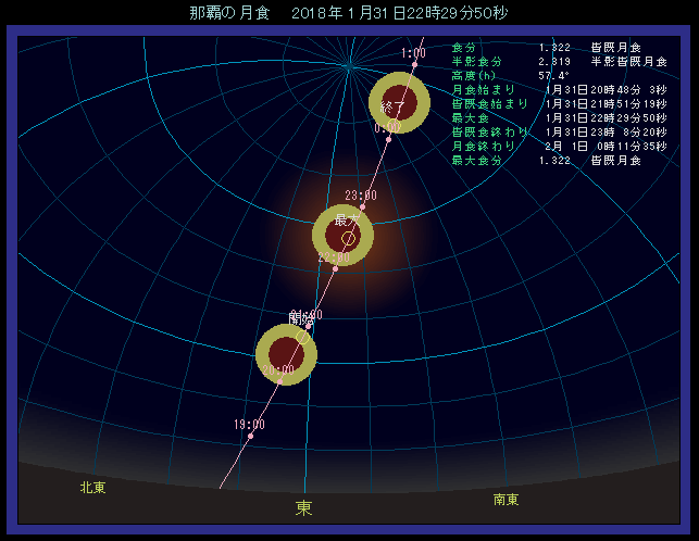 どの場所から見ても月食の進行に合わせ、高度を上げながら東から南へ、右上方向に移動していきます。高度の上がり方は北の地域ほど緩やかで、南の地域ほど一気に高くなります。月の経路を示すピンク色の線の傾きは、札幌よりも那覇の方が垂直に近くなっています。