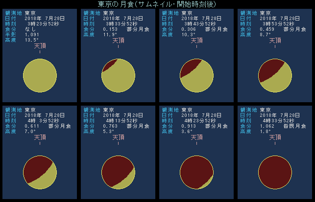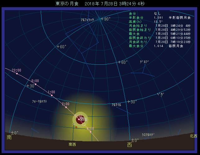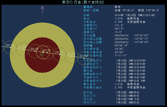 半影食の始まり 7月28日 2時13.1分 部分食の始まり 3時24.2分 皆既の始まり 4時30.0分 食の最大 5時21.7分 皆既の終わり 6時13.5分 部分食の終わり 7時19.3分 半影食の終わり 8時30.4分 最大食分 1.613
