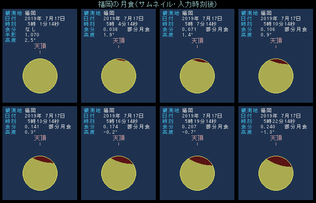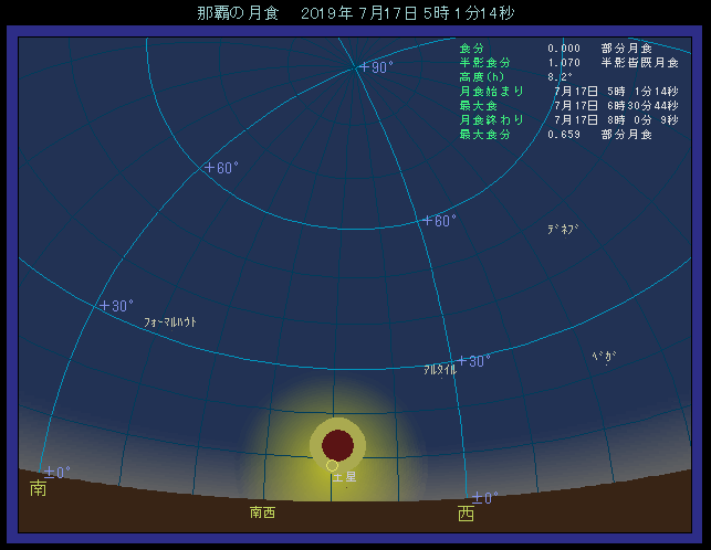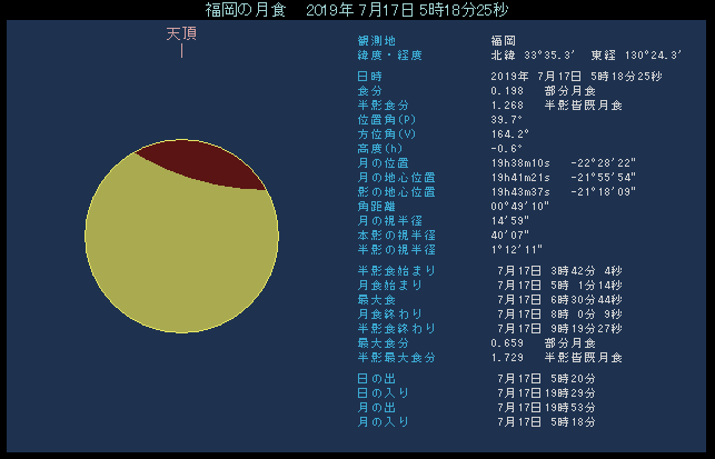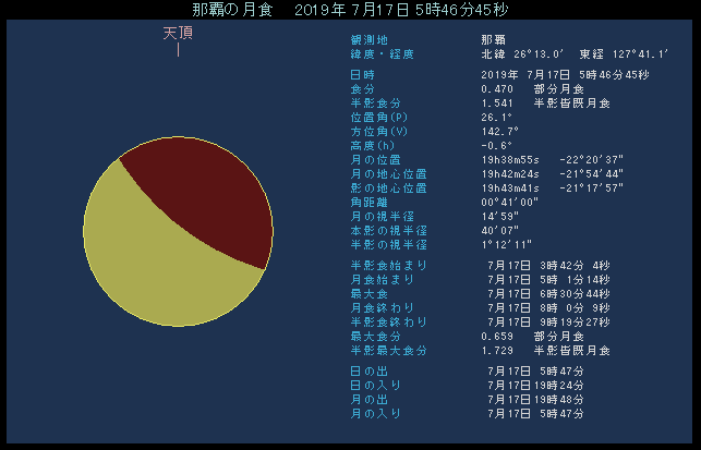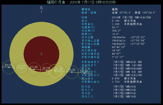 半影食の始まり 7月17日 3時42.1分 部分食の始まり 5時01.3分 食の最大 6時30.7分 部分食の終わり 8時00.1分 半影食の終わり 9時19.4分 最大食分 0.658