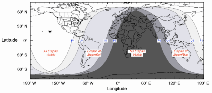 NASAが提供する月食図をご覧ください。世界のどの地域で月食が見られるかを示したものです。最も条件が良い地点は星マークで示され、ハワイよりも東側の太平洋上です。