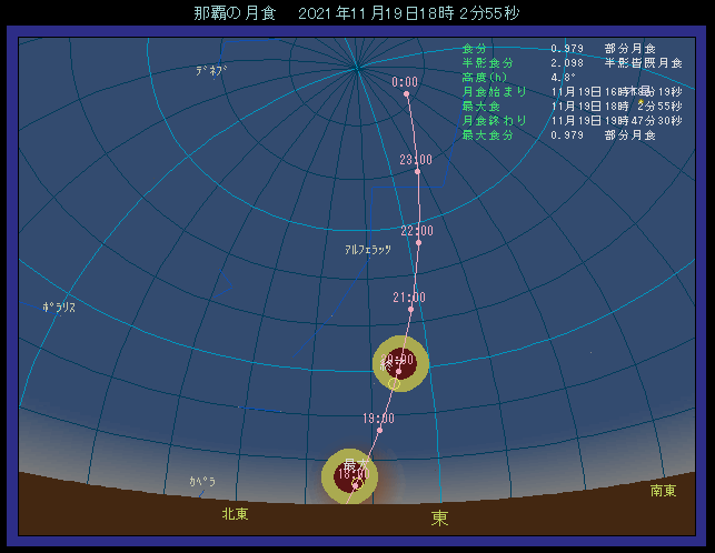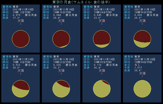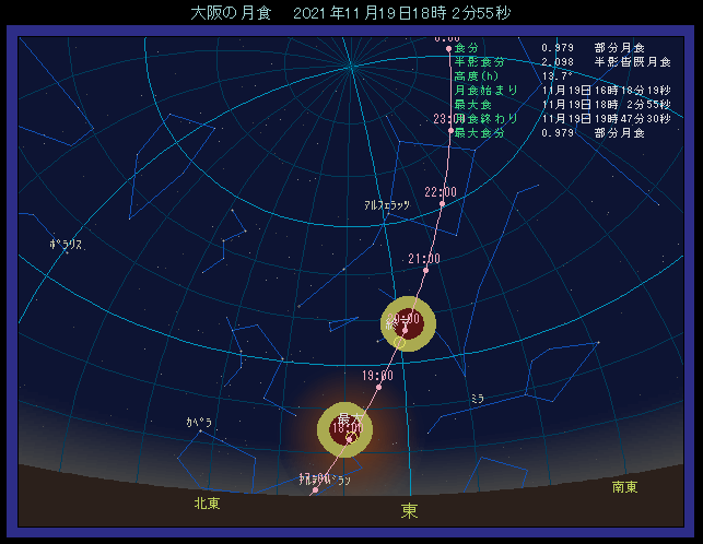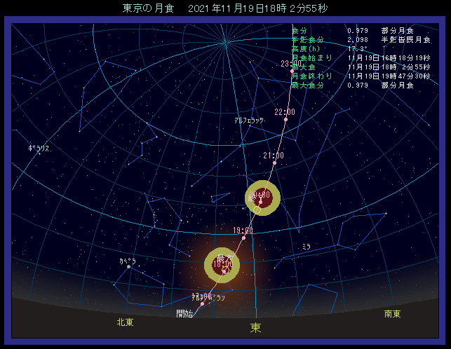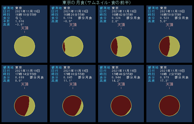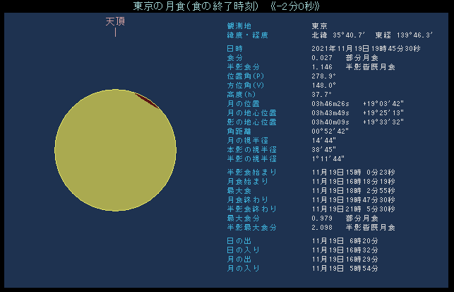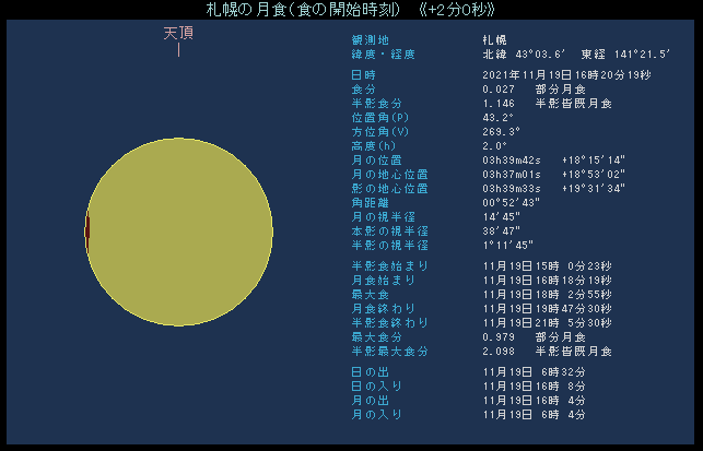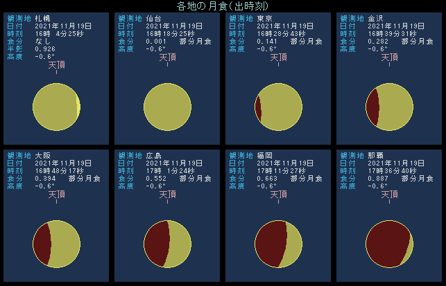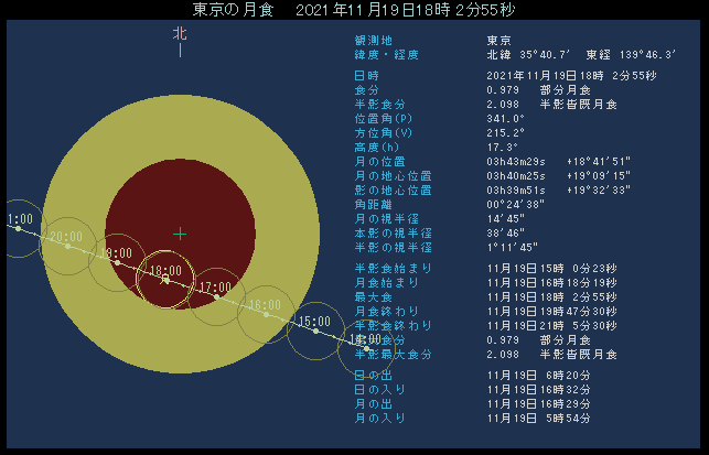 半影食の始まり 11月19日 15時00.4分 部分食の始まり 16時18.4分 食の最大 18時02.9分 部分食の終わり 19時47.4分 半影食の終わり 21時05.5分 最大食分 0.978