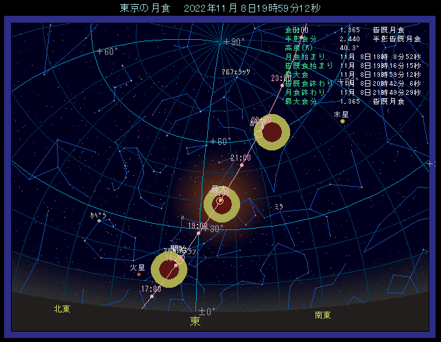 月は概ね東から南東の方角に見えます。開始の頃は低い位置にありますが、食が進むにつれて高度が高くなります。