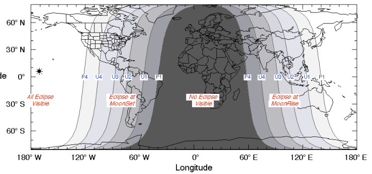 月食が見られる地域(NASA提供の月食図) |