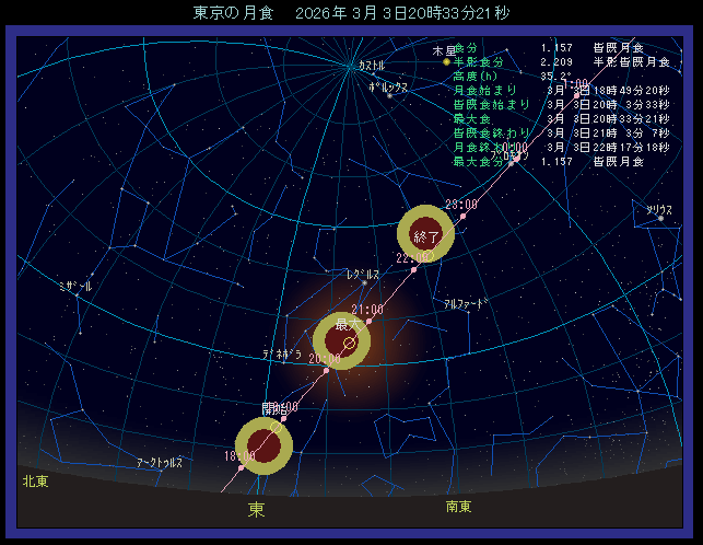 東京で見える位置(星座は最大食時のようす) |