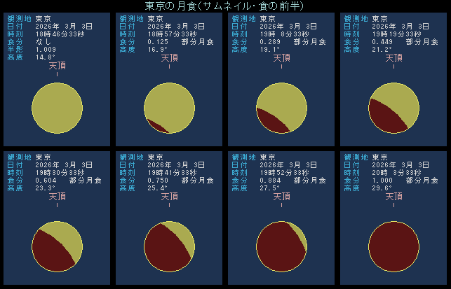 下の絵は、右下の皆既食始まりを基準に、時間をさかのぼりながら11分間隔で月の欠け方を描いたものです。3月3日の18時49分に、月の左下から欠け始めます。