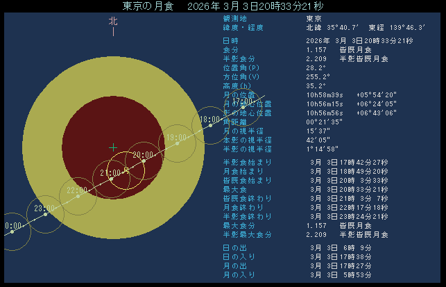 皆既食は20時4分に始まります。皆既はちょうど1時間ほど続きます。21時3分に皆既食が終了すると復帰が始まり、22時17分に通常の満月に戻ります。