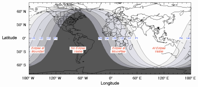 月食が見られる地域(NASA提供の月食図) |