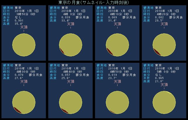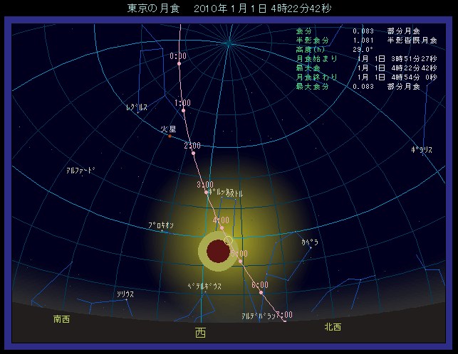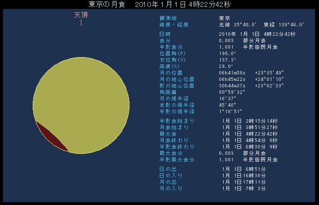 ということで、次回元旦に月食が見られるのは19年後のことになってしまいますから、今回じっくりと味わっておくことにしましょう。紹介したように1時間ちょっとという、短くて小さな部分月食ですが、月食が終わる頃にはもうすぐ夜明け。そのまま2010年 初日の出を迎えるというのはいかがでしょうか。一年最初の日に月食と初日の出を見て、ちょっと得した気分で一年をスタートしませんか。