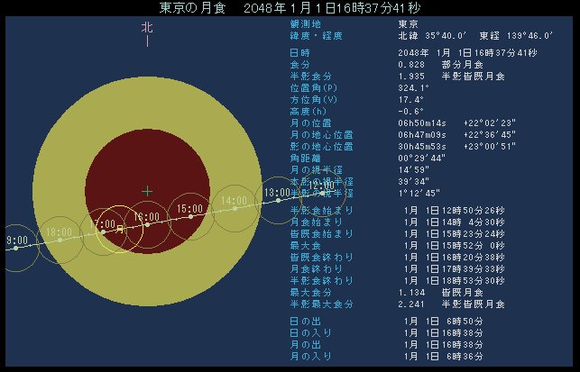 さらに19年後には再び元旦月食が起こります。今回も皆既月食なのですが、前回とは違ってお昼過ぎ以降からの現象となり、月の位置は、はるか地平線下で欠け始めます。月の出が早い東京でも、月が昇ってきた頃には皆既状態が終了しており、後半の部分月食を楽しむことになります。下の絵は東京での月の出時刻におけるデータを掲載したものです。