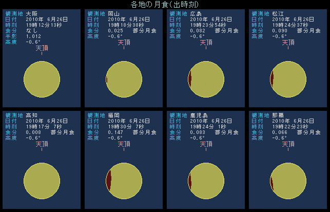 下の絵は西日本各地の主な8地点で、月の出時刻にどれだけ月が欠けているかを示したものです。大阪では月の出時点で食分「なし」とありますから、欠け始めを観測することができます。しかし、大阪よりも西に位置する岡山では、月の出時刻の食分は0.025とありますので、ほんの少しだけ月が欠けた状態で昇ってくることがわかります。福岡ではもっと顕著で、15%ほど欠けた月の出となります。