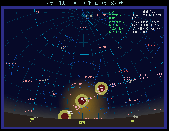 今年2010年は月食が3度見られる珍しい年です。元旦に続いて6月26日にも月食が見られ、今年に入ってから2度目の月食となります。今回は直径の54%が欠けますから、ちょうど半分といったところでしょうか。下の絵は東京で最も欠けた頃のようすです。月は右下の半分を残して地球の影に隠されることがわかります。月食が起こるのが土曜日ということや、子供さんでも見やすい時間帯であることから、親子そろって天体観測されるという方がおられるかもしれませんね。ぜひお見逃しなく!