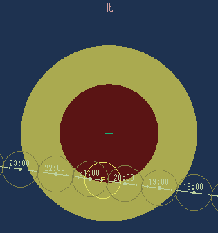 ※このページの画像は「天文ソフトつるちゃんのプラネタリウム シェア版」に含まれる「つるちゃんの日食ソフト」プラグイン機能を使用しています。数値は若干の誤差(時間で数秒程度)を含みます。