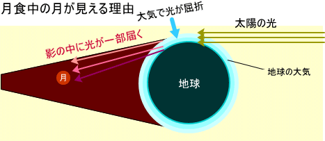 皆既月食では月が地球の影の中へ完全に入り込みます。月は太陽の光が届かない影の中にいるはずなのに、どうして肉眼で見ることができるのでしょう。それは地球の大気によるしわざです。