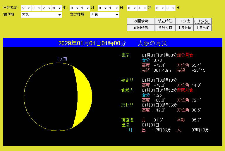 無料で月食をシミュレーションしたい方は、当サイト内にある「つるちゃんのプラネタリウム for Javaアプレット」にある「日食と月食」がオススメです。月食で月がどのように欠けていくかを手軽に知るのには、うってつけのソフトです(誤差を含みます)。インターネット上でシミュレーションできるのでとても便利ですが、Javaアプレットを使える環境にしておく必要があります。