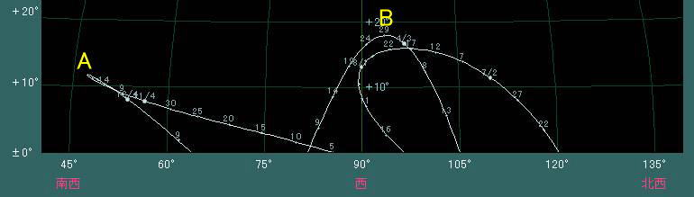 例えば下の例は2004年の日の入り時における水星の位置変化を示したものです。Aの場合の太陽からの離角は22.3度で、Bの場合の太陽からの離角は18.9度ですが、Aは地平線に対して斜め方向に離れているので、地平線に対して垂直方向に離れたBの場合よりも高度が低くなっています。要するに離角が大きいことが重要なのではなく、日の出もしくは日の入り時刻における水星の高度が高いことが重要だということです。