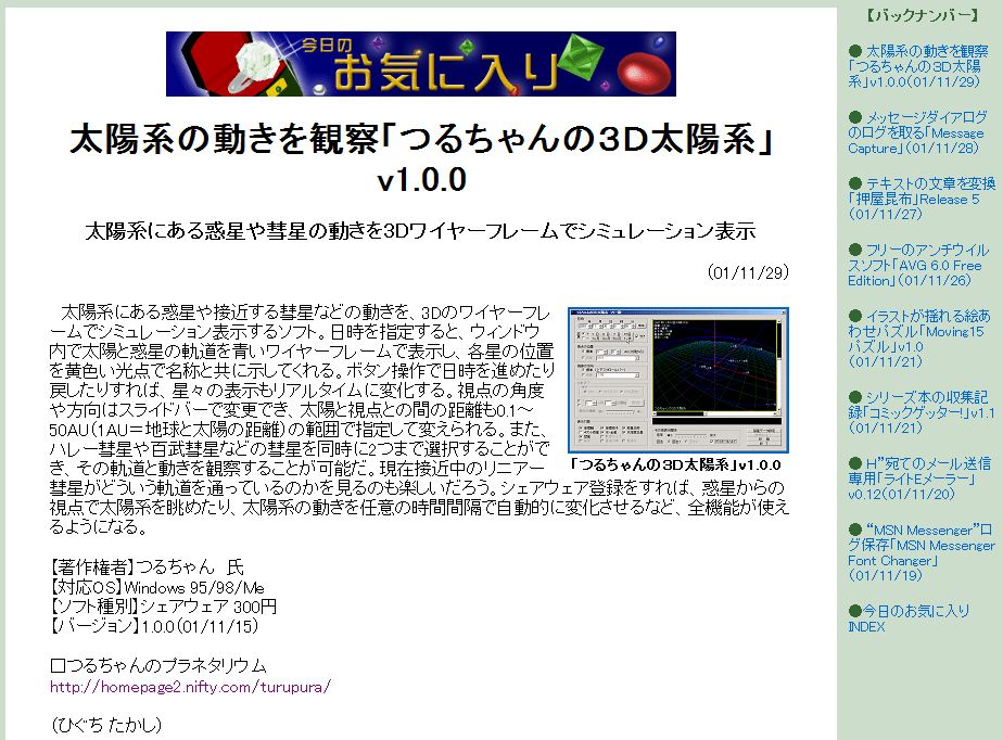 窓の杜、今日のお気に入りコーナーで、2001年11月29日に「つるちゃんの3D太陽系」が紹介されました。窓の杜で紹介されたのは、つるちゃんシリーズのソフトで第一号となりました。