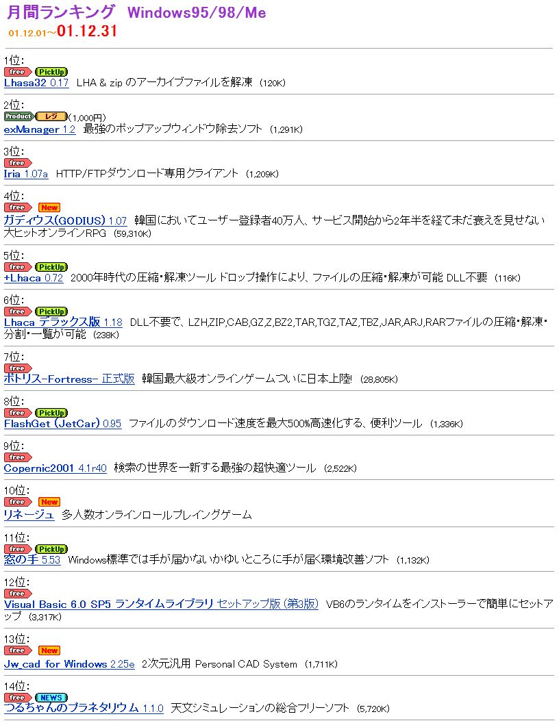 天文ソフトつるちゃんのプラネタリウムは、バージョン1.1.0がベクターで新着ソフトレビューされました。この結果ダウンロード件数が大きく伸び、2001年12月の月間総合ランキングで14位となりました。1ヶ月間の同ソフトダウンロード件数は31,225件に達しました。