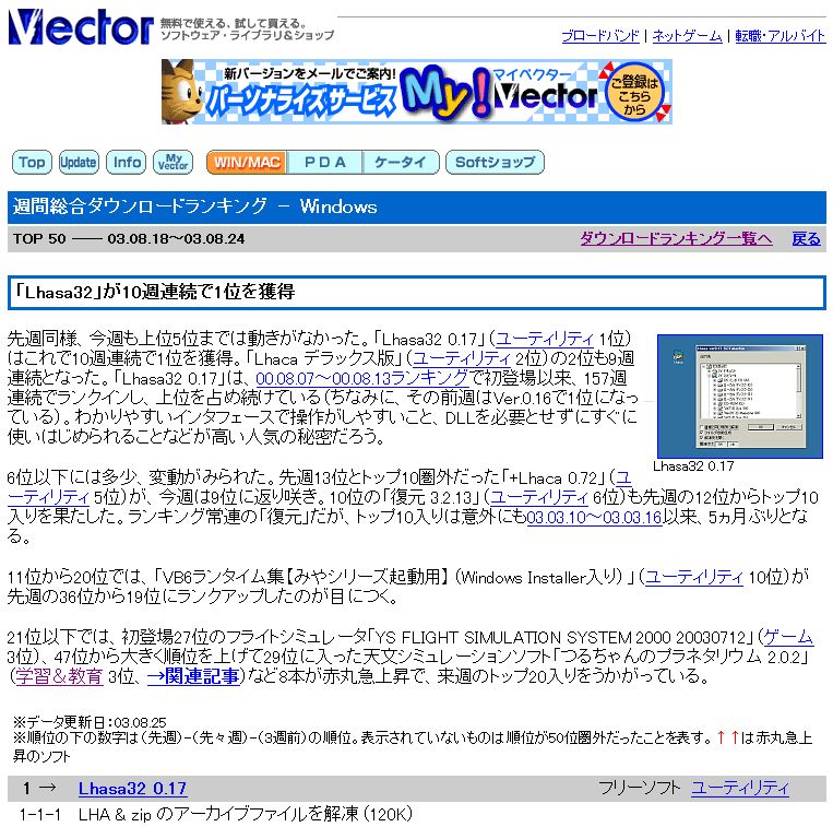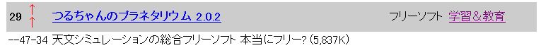 2003年8月25日にベクターの総合ランキングで、天文ソフトつるちゃんのプラネタリウムが29位にランクインしました。これはソフトウェアスポットライト「天体を知る・見る・遊ぶ」の特集コーナーで、2003年7月26日に天文ソフトつるちゃんのプラネタリウムが紹介され、ダウンロード件数が一気に増えたためです。