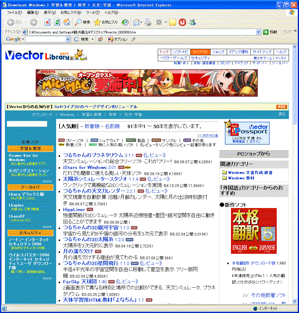 2006年9月8日にベクターの天文・宇宙ジャンルで、つるちゃんシリーズのプログラム5本全てがベスト10入りしました。