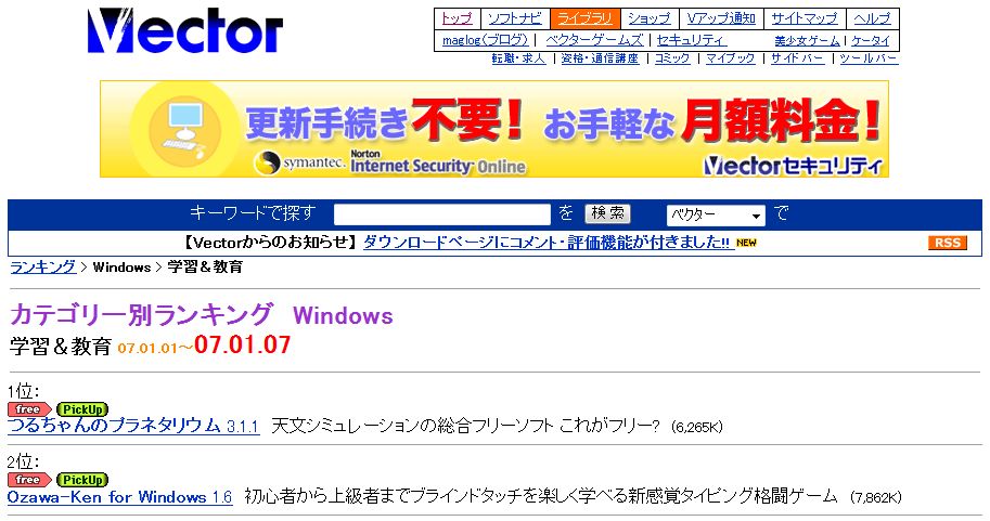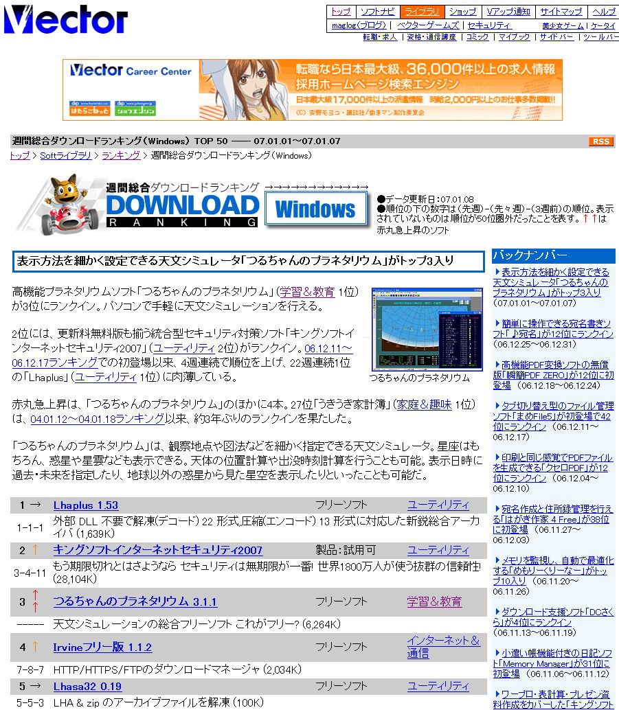 ベクタートップページ左側のランキングで、天文ソフトつるちゃんのプラネタリウムが3位と表示された