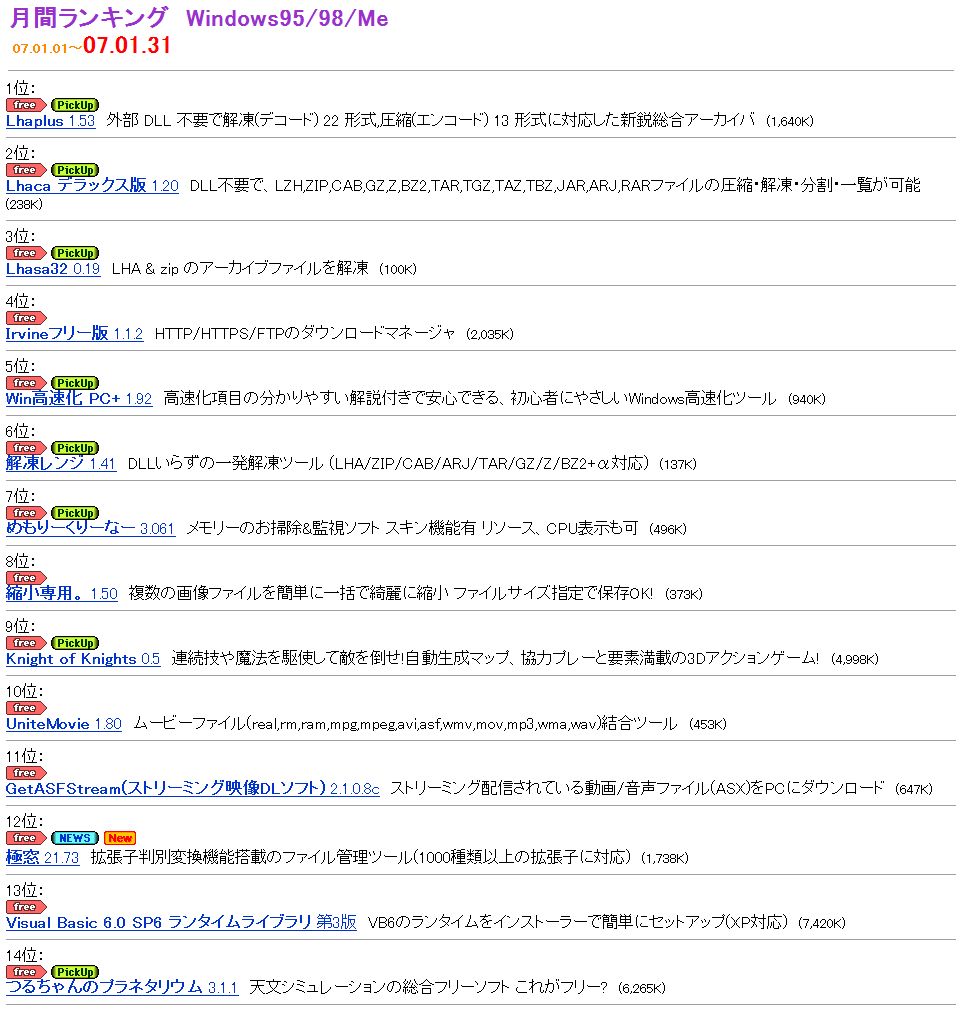 天文ソフトつるちゃんのプラネタリウムが2007年1月に朝日新聞で紹介されました。これによってベクター2007年1月の月間総合ダウンロードランキングで14位となり、自己ベストタイ記録となりました。