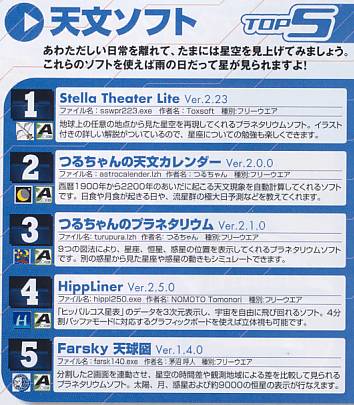 天文ソフトのトップ5として、2位がつるちゃんの天文カレンダー、3位がつるちゃんのプラネタリウムとして紹介されました。