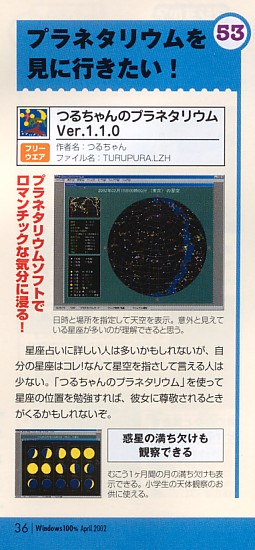 天文ソフトつるちゃんのプラネタリウムが、ロマンチックな星空を満喫できるソフトとして紹介されました。これは、つるちゃんシリーズのソフトが初めて雑誌に紹介されたもので、当時のつるちゃんにとっては衝撃的な出来事でした。