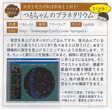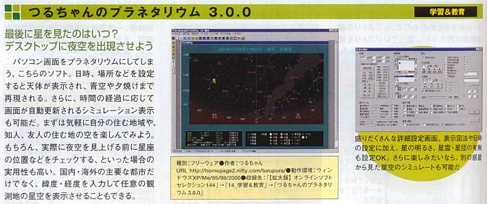 日時、場所などを指定すると天体が表示され、パソコン画面をプラネタリウムにしてしまうソフトとして、天文ソフトつるちゃんのプラネタリウムが比較的大きく紹介されのました。この他にも、つるちゃんの3D銀河宇宙が取り上げられました。