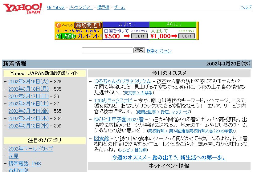 当サイトつるちゃんのプラネタリウムがYAHOO!の新着情報(今日のオススメ)で1番目に、「夜空から春の訪れを感じてみませんか? 星図で勉強したら、見上げる星空もぐっと身近に。今夜の土星食の情報も見逃せない。」と紹介されました。 あわせてYAHOO!のディレクトリ(天文学>太陽系)にも登録されました。これをきっかけに、以降は当サイトが広く知られていくようになりました。